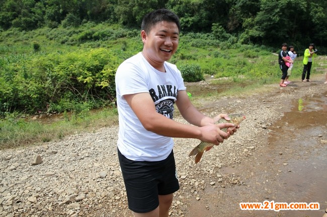 另外還有抓魚比賽。徒手抓魚可不是那么容易,不一會兒家長們就汗流浹背了,皇天不負有心人,這位爸爸掌心中握著一條兩斤多的羅非魚,向大家展示著他的戰利品,臉上笑開了花。