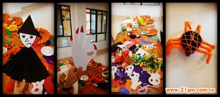 在節日到來之前,全園師生精心準備,共同進行萬圣DIY制作,各種詭異的鬼臉,可愛的南瓜,生動的蝙蝠……將幼兒園裝扮一新,讓孩子們更加滿心期待這一神秘節日的到來!