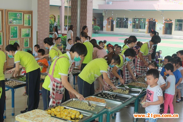 慶生會(huì)要搭配著豐富美味的自助餐才完整。色彩鮮艷、品種繁多的食物整齊地兩排陳列著供兩個(gè)班級(jí)同時(shí)取餐。小班的孩子們先選取食物,大班的孩子或進(jìn)行有趣的桌面游戲或者聊天分享地耐心等候著,我們看到了一份謙讓和關(guān)愛(ài)。孩子們都已經(jīng)能夠掌握了自覺(jué)排隊(duì)、自主選取食物和吃完食物不浪費(fèi)等用餐禮儀了。