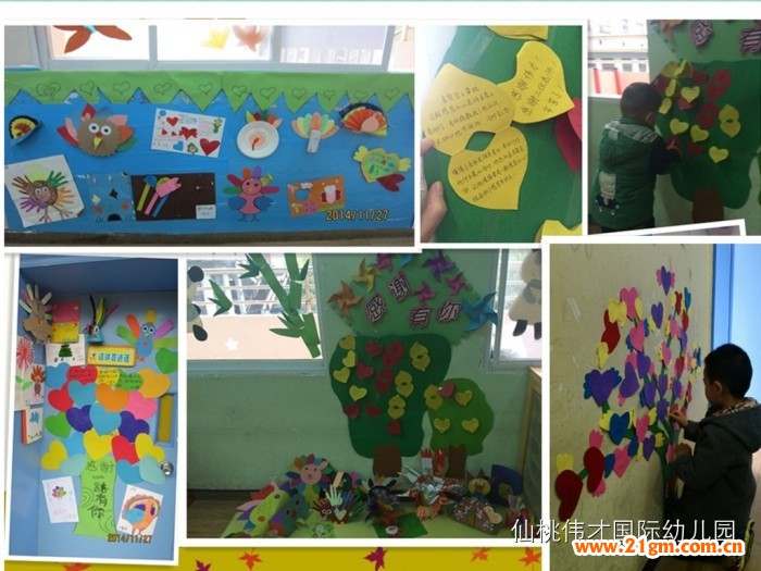 11月24日,感恩節親子手工DIY活動啟動,各班級的幼兒將自己動手制作的“感恩小禮物”分享在大廳,并邀請家長們來園參觀,小小禮物里,讓爸爸媽媽、爺爺奶奶不僅看到孩子的點滴成長,更欣慰著孩子給整個家庭帶來的溫暖與感動。班級的主題墻和門上充滿著濃濃愛意,感恩樹記錄下每個家長和孩子們心中最想表達的感謝。