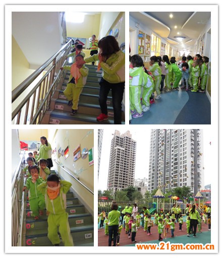 活動當日上午9:50,孩子們正在專心地上課,樓道里突然濃煙竄起,警報聲也驟然響起,各班教師迅速按緊急預案的疏散線路帶領幼兒拿起濕毛巾,捂住口鼻,貓著身子,在身著消防衣的引導老師指揮下,迅速朝兩邊樓梯撤去,很快孩子們集中到操場安全地帶,各班老師迅速地清點人數,并向園長報告。整個疏散活動用了不到五分鐘,與上一次的演練活動相比,疏散速度快了許多。