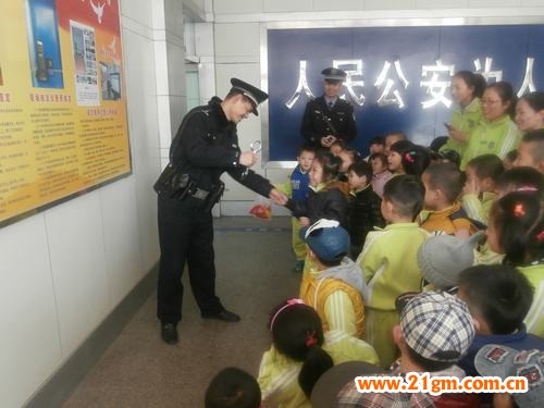 走到警察局門口,幾位刑警叔叔早早的站在門口等待我們小朋友的到來,孩子們看到后都一個勁兒的問“警察叔叔好”。進入大廳,負責接待的警察向孩子們講述了警察的配備與裝備,展示了各種器械的用途與使用方法,孩子們聽的、看的可認真了;進入二樓的監控室,警察調出了一段監控錄像,讓孩子們仔細觀察,看看發現了什么,原來這是一段盜竊電動車車瓶的錄像,刑警叔叔用童真的語言向孩子們講述了抓捕盜竊犯的過程,并教育孩子回家后向爸爸媽媽講述如何防范被盜竊。活動進入尾聲,警察調出了幼兒園的監控錄像讓孩子看,并告訴孩子們有警察叔叔的保護,大家可以安心的學習和游戲。