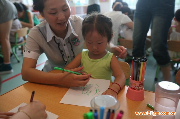 剛入園的孩子對教室里的一切都充滿了好奇,不時的這邊看看那邊摸摸,為了吸引孩子們的注意力,小一班的鄭老師先表演了一個小魔術,看著瓶子中的純凈水在鄭老師施完“魔法”后都變了顏色,孩子們立刻眼睛都睜得大大的盯著老師和水瓶,想尋找里面的奧秘。隨后,孫老師又帶領孩子們進行了“神奇的小手”活動,讓孩子們認識了自己的小手,并教孩子們用自己的手作畫。畫筆在孩子們的小手中來回游走,不一會兒,這群孩子在幼兒園的第一幅作品已經完成,在老師的幫助下,孩子們興奮的將自己的作品粘貼在了展板上,看著自己的作品,孩子們高興地雀躍起來,家長也在一邊兒露出喜悅的神色。在優美的音樂聲中老師還帶領孩子和家長一起做起了親子操。此時此刻,歡聲笑語充斥在幼兒園的每個角落,天真的孩子認識了新朋友,而此時此刻的家長也仿佛回到了童年時光。