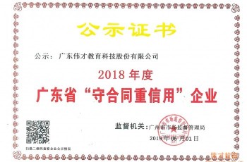 日前,廣東省市場監督管理局對2018年度廣東省守合同重信用企業進行公示,廣東偉才教育科技股份有限公司(簡稱偉才教育)榮獲2018