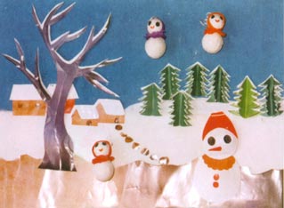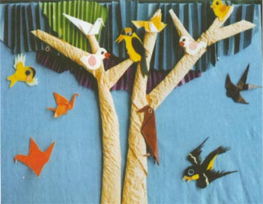 為了促進幼兒空間概念的發展,室內環境布置的物品,要從平面造型向立體、半立體造型發展。表現立體、半立體造型,在幼兒園通常使用折疊方法,如用彩色紙折疊動物、花、樹葉等。捏的方法如用彩泥塑造立體形象。卷的方法是用一個圓棒為軸,用舊掛歷紙或牛皮紙包裹兩至三層粘成長筒,可作房舍、樹干、樹枝和欄桿等。浮雕方法是按山線谷線畫線再折成半立體造型。紙編方法是用線條編織成動物、人、花草等,這種方法比較難,可由教師來做。布置環境離不開樹木、花草、房舍、動物、人物等形象,教師要動腦筋想辦法,用簡單的方法表現復雜的事物,力求設計方法簡單,形象美觀。制作方法與使用的材料見墻壁裝飾實例。