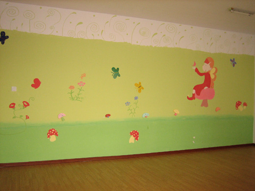 藝術(shù)幼兒園環(huán)境,首先在色彩上,應(yīng)該給幼兒以美的視覺享受。圖畫色澤宜單純,接近自然,這樣的色彩令純潔的孩子們產(chǎn)生豐富的想象:廣袤無邊的綠色草原、密密的森林、遼闊的藍天、飄浮的白云、蔚藍的海洋和可愛的小動物們。這些單純、源于自然的色彩,易使閱歷淺短的幼兒產(chǎn)生共鳴、易于理解。便于他們欣賞、借鑒、表現(xiàn)。幼兒們喜愛明快的色彩對比,活潑好動的幼兒從中可以感受到色彩變化的節(jié)奏和共振。在為幼兒們創(chuàng)造色彩對比、跳躍的同時,應(yīng)考慮畫面的整體美,采用較大淺色塊支撐,可使畫面既有局部美的變化又有整體協(xié)調(diào)感,能解決幼兒園一堵墻面內(nèi)容多色調(diào)不易統(tǒng)一的問題。使環(huán)境更藝術(shù)化。