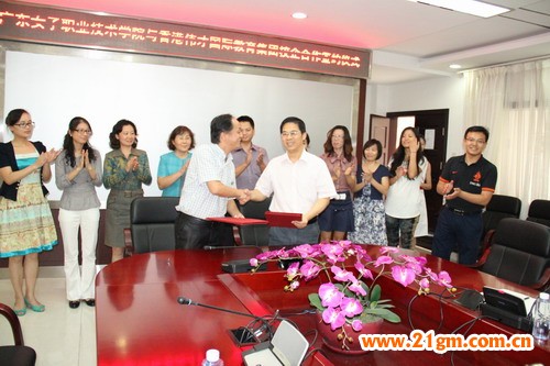 偉才公司羅總(左)和女子學院肖教授(右)簽約圓滿成功