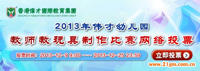 本次比賽是偉才兒研會2013年的壓軸活動,得到了體系內各園所的積極響應。為擴大本次活動的參與規模,提供偉才教師一個更廣闊的展示平臺,偉才兒研會特增加網絡投票環節。通過初步篩選后,獲得參賽資格的區域教玩具作品、制作過程照片及對應設計方案已發布在偉才教育網(網址www.yjysy.com)上。歡迎各園所老師、家長及小朋友積極參與投票。同時各園所可將優秀成果進行借鑒,增進體系內教育教學的交流探討,實現資源共享。