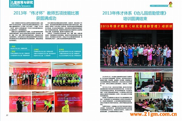 雜志中還記錄了由偉才國際兒童教育研究分舉辦的多項國際交流、比賽、培訓等活動,例如“2013年偉才園長香港參訪交流”、“2013年《偉才杯》教師五項技能大賽”、“美的教育•美的享受――2013偉才《奧爾夫暑期夏令營》教師培訓”等等,這些活動均獲得了偉才體系幼兒園的園長、老師們的好評,特別是參加了“2013年偉才體系《幼兒園后勤管理》培訓”的老師們,在培訓結束后紛紛表示受益匪淺、意猶未盡,并希望這樣的培訓能再多舉辦幾期。