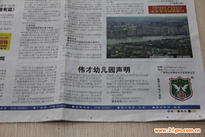 近期,我公司發現在仙桃市范圍內存在幼兒園未經我公司授權,擅自使用我公司“偉才”注冊商標(包括近似標識)及“偉才”品牌,假冒“偉才”名義開展宣傳、招生等經營活動。為了更進一步、更有力地提醒廣大市民謹防受騙,偉才幼兒園在仙桃地區影響力極大的《仙桃日報》(2014年5月5日總第5920期)上鄭重刊登了《偉才幼兒園聲明》 ,敬請廣大市民認準我公司的注冊商標,明辨真偽,謹防假冒!