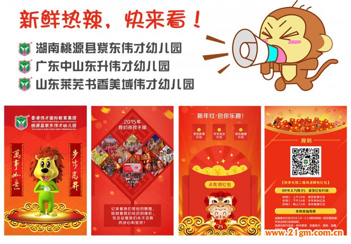 2016偉才春節之------家園互動主題網絡活動“新年紅.包你樂趣”,在2016年2月23日圓滿畫上了句號。通過本次好玩又接地氣的網絡活動,提升了偉才品牌影響力,同時加強了偉才園所、家長、孩子之間的互動和交流。本次報名參加“新年紅.包你樂趣”活動的園所有共50多家,據不完全統計,活動宣傳頁面總瀏覽數達到60000多人次,偉才家長們積極參與和傳播,整體覆蓋人數達到了110000多人。