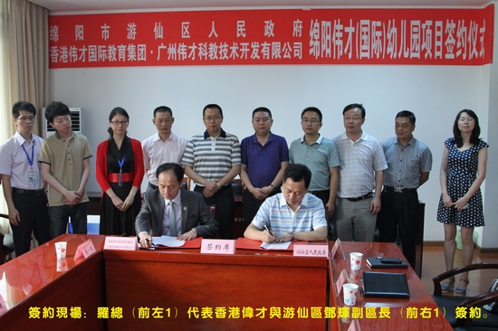 翌日,由游仙區(qū)人民政府副區(qū)長鄧輝先生牽頭,協(xié)同游仙區(qū)政府辦副主任李全堂、游仙區(qū)教體局黨委書記、局長李成建、游仙區(qū)城鄉(xiāng)建設(shè)和住房保障局黨組書記李昆、游仙區(qū)區(qū)招商局黨組書記、局長付文東、綿陽市國土資源局三分局局長李蔚智、綿陽市城鄉(xiāng)規(guī)劃局游仙規(guī)劃所所長向新望、游仙經(jīng)濟(jì)試驗(yàn)區(qū)黨工委書記安明洪等相關(guān)部門領(lǐng)導(dǎo)與香港偉才教育集團(tuán)在區(qū)政府會(huì)議廳舉行了盛大的媒體見面會(huì),并簽署了《香港偉才教育集團(tuán)綿陽游仙學(xué)前教育項(xiàng)目投資意向書》,這預(yù)示著該項(xiàng)目的落成將對(duì)綿陽學(xué)前教育帶來嶄新的一頁!